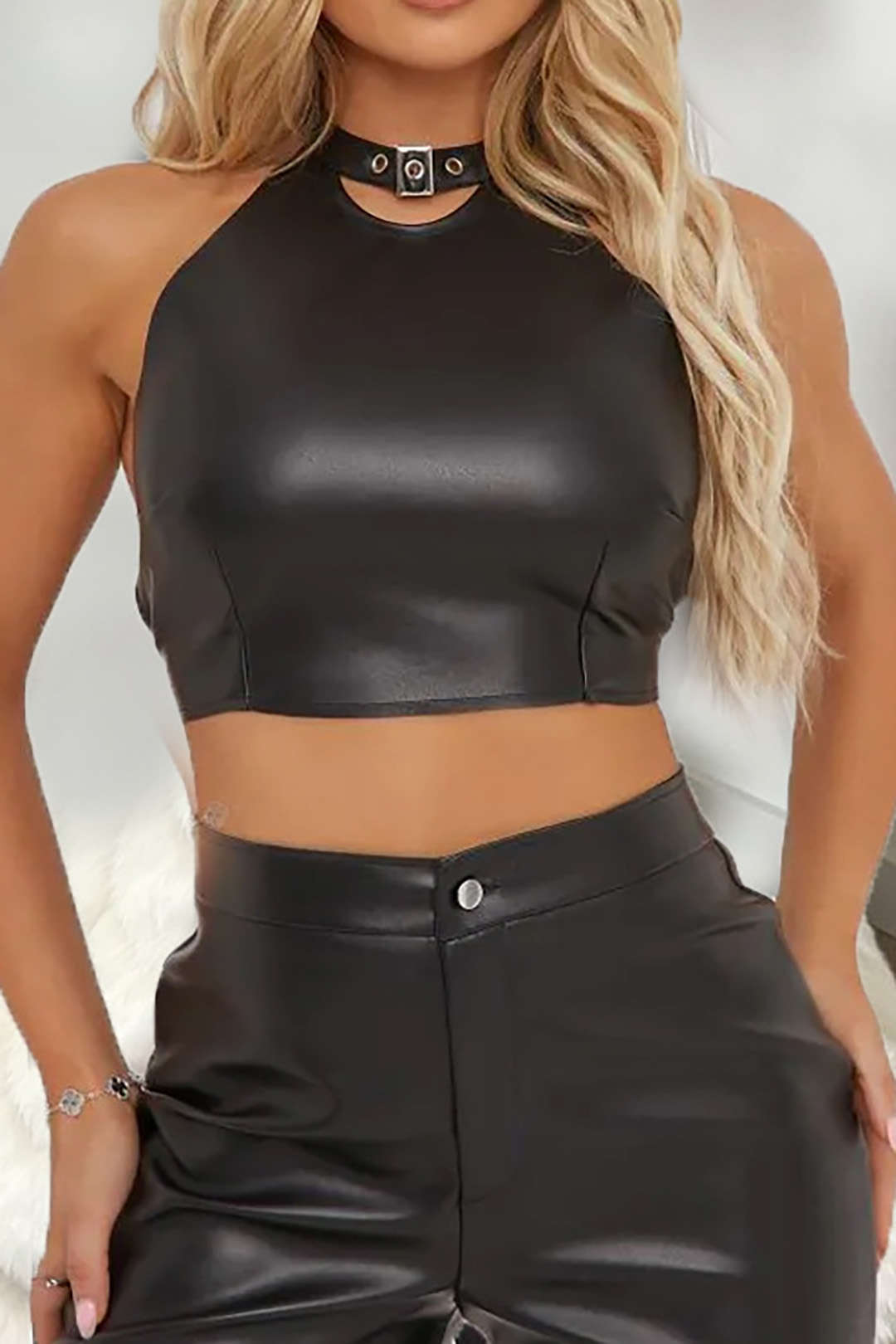 Edgy Faux Leather Backless Halter Top: Trendy Outfit Ideas for Y2k Style