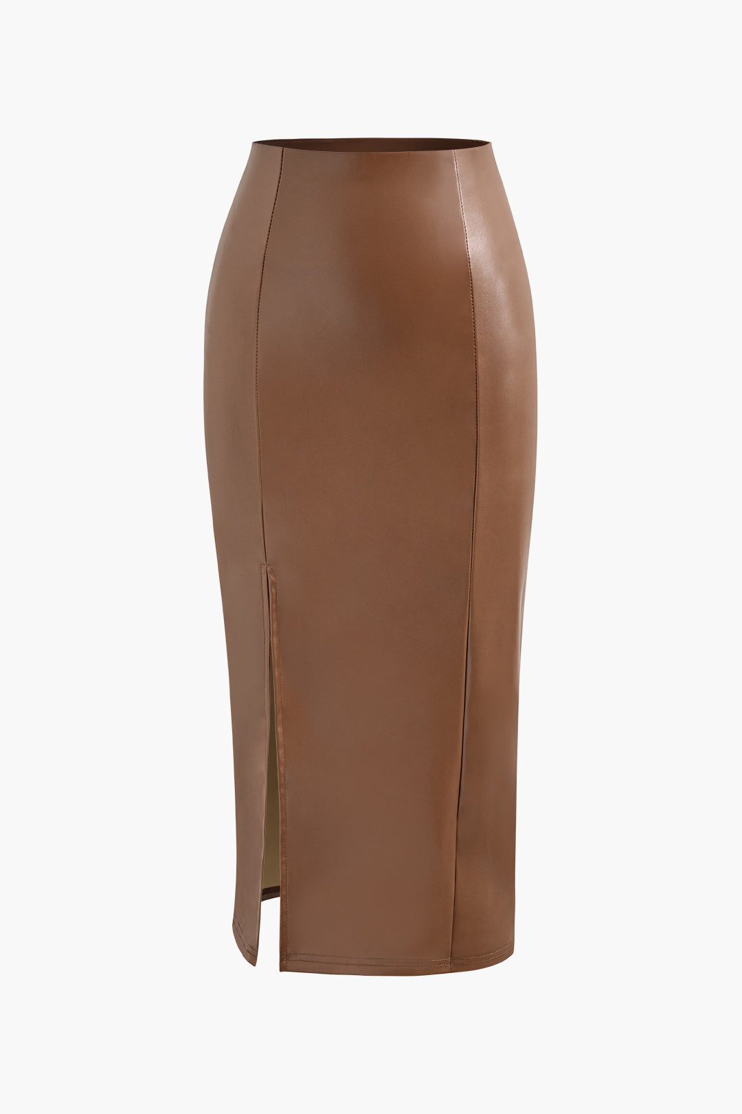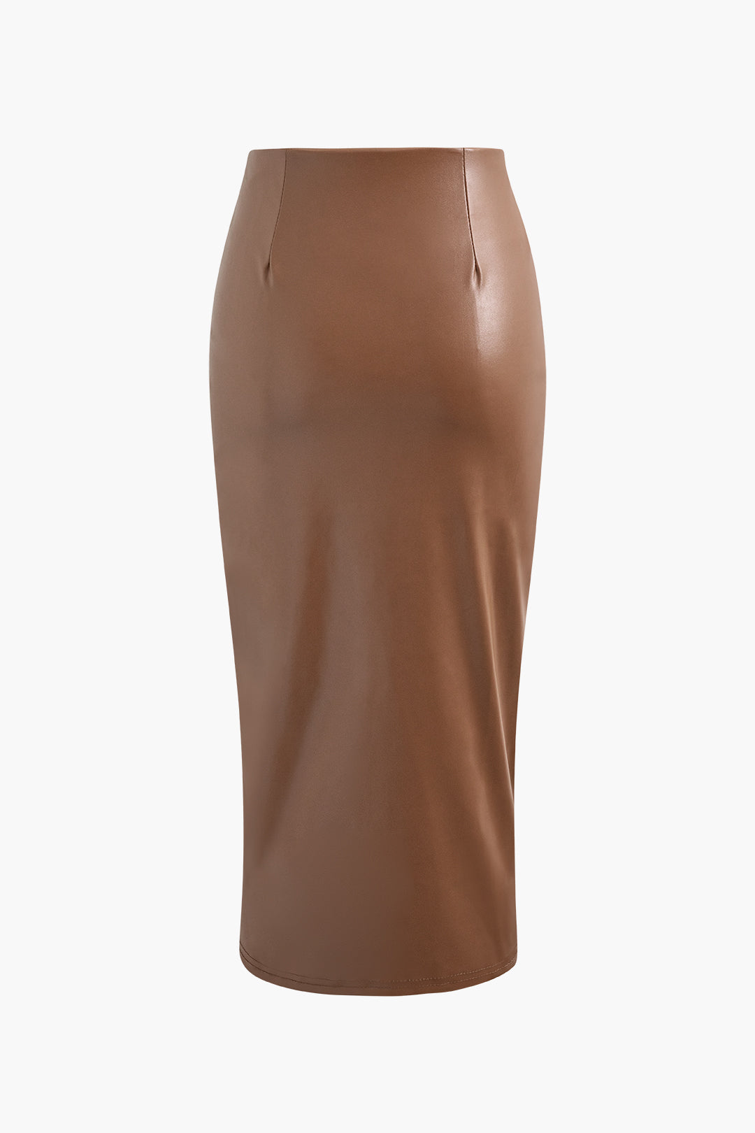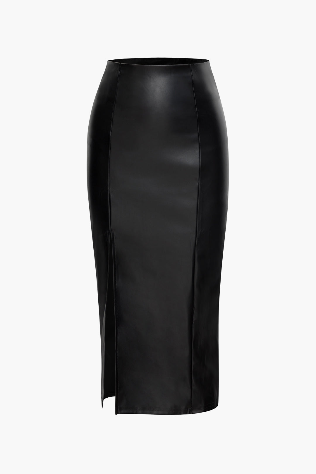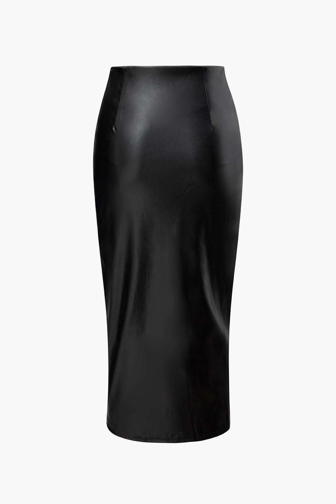 Ready to make a statement? Shop now and redefine your summer style with our Y2K Faux Leather Cami Top & Slit Midi Skirt Set!