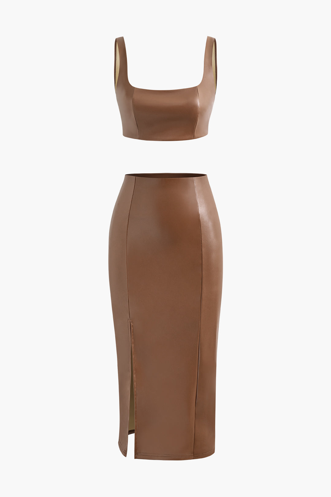 Faux Leather Cami Top Slit Midi Skirt Set Y2K Coquette High-quality product featuring prom dresses, spring outfits, business casual outfits and more. Modern design that fits the latest trends. Premium materials ensure durability and comfort. Order now for special offers! Product designed with attention to every detail. Suitable for all occasions and personal styles.