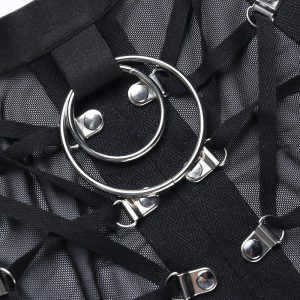 Steeped in gothic influences, this black piece’s backless design, cropped length, and tie front capture the rebellious spirit of the underground scene. Ideal for night owls, its ethereal mesh material pairs flawlessly with faux leather minis or distressed denim for an audacious touch to your ensemble.