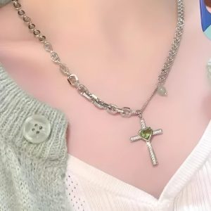 Embrace the goth aesthetic with our Shiny Heart Cross Necklace. Featuring a sparkle cross design with a green heart-shaped stone detail and bead accents on the chain, this zinc alloy necklace is cool, unique, and makes for a great gift.