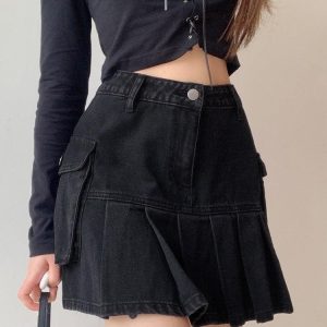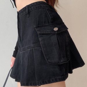Rock the grunge aesthetic with this black, dark wash denim mini skirt. Featuring a high waist, zip & button fastening, and pleated detailing, it’s a polyester stunner. The two side cargo pockets add a dash of functionality to the chic. The perfect fusion of edgy and fashionable, ready for your wardrobe adventures.