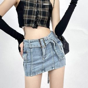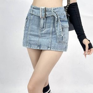 Designed with grunge lovers in mind, this blue, light wash denim skort combines shorts and a skirt for a unique take on casual streetwear. Its front zip fastening and included belt offer convenience and style, while the cargo pockets enhance its utilitarian appeal. Pair it with band tees or cropped halter tops for an edgy, youthful look.