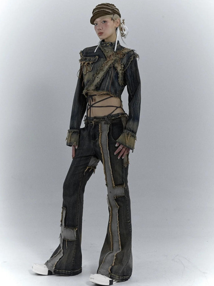 These Grunge Cross Patch Jeans bring a bold edge with distressed cross patches and frayed details on dark-washed denim. The wide-leg flare pairs perfectly with chunky shoes or platform boots for a rugged look.