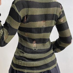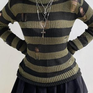 Break the monotony with a green distressed knit sweater featuring black stripes. This piece, with its grunge aesthetic, can inject some rebellion into any outfit. Ideal for teaming with black pleated mini skirts for a coordinated look.