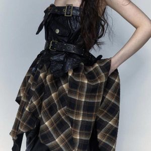 Channel your inner rebel with our Grunge Faux Leather Plaid Midi Skirt. This grunge aesthetic piece features an asymmetric design, lace-up and belt details at the waist, and is designed to be worn both as a skirt and as a tunic. Perfect for punk, streetwear, cool, and bold styles.