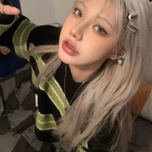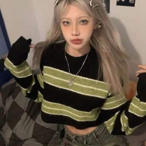 Immerse in the grunge vibe with this black and green striped crop sweater. Crafted from knit material, it offers both warmth and a statement look. The long sleeves and cropped design make it a perfect pick for women who love to blend streetwear trends with cozy winter essentials.