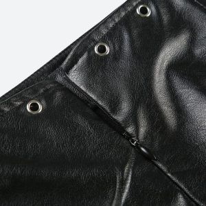 Bring the attitude. This low-rise faux leather mini skirt is all about bold rebellion and unapologetic style. With sharp spiked accents and silver grommet detailing, it delivers that iconic grunge edge. The back zip closure makes it easy to slip on and off, while the smooth faux leather finish adds a sleek feel to every look.