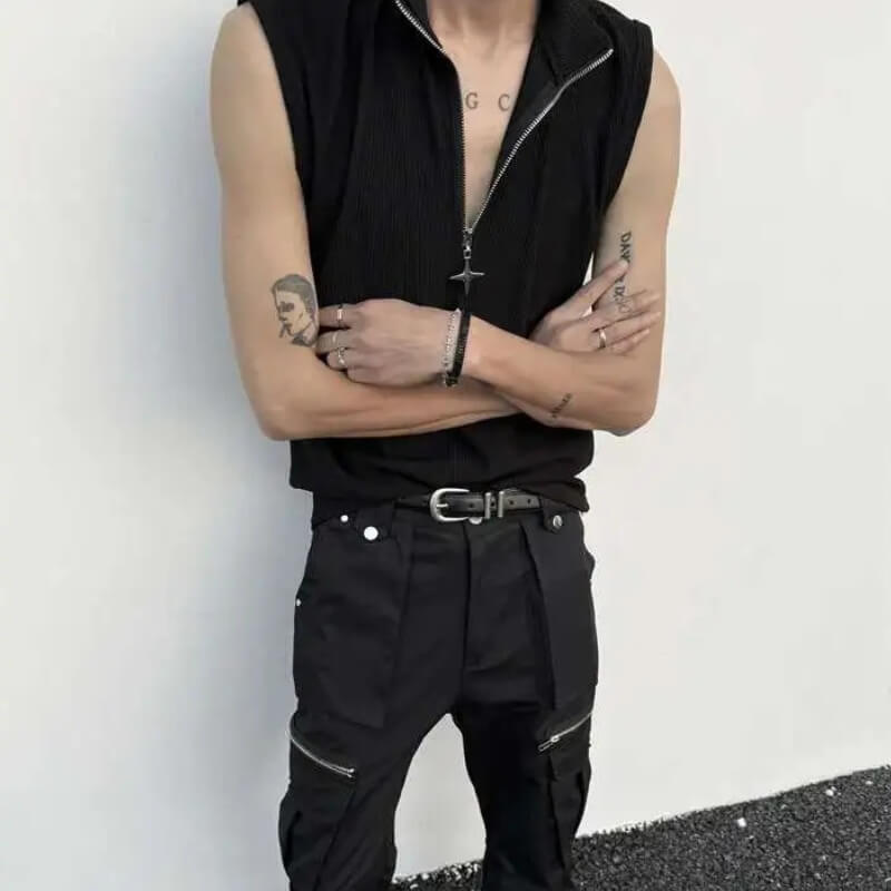 The High Neck Ribbed Zip Top brings a sleek, minimal edge to any outfit. Designed with a ribbed texture and zip-up front, it combines structure with comfort. The sleeveless cut and high neckline create a flattering fit that pairs easily with trousers, jeans, or layered under jackets for an elevated, modern look.