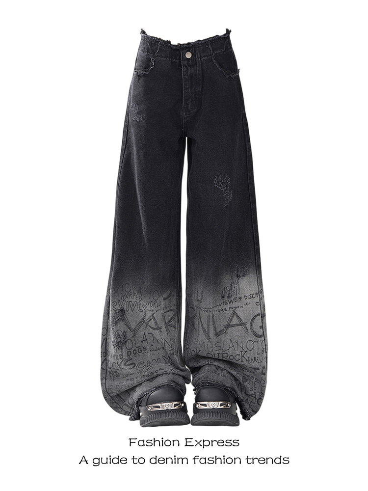 High Waisted Black Gradient Graffiti Jeans Women Wide Leg Floor Length Pants Autumn/Winter High-quality product featuring prom dresses, spring outfits, business casual outfits and more. Modern design that fits the latest trends. Premium materials ensure durability and comfort. Order now for special offers! Product designed with attention to every detail. Suitable for all occasions and personal styles.