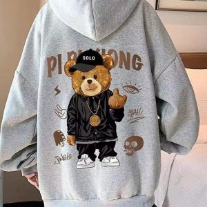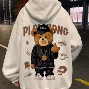 Echoing the vivacity of hip hop culture, this men’s hoodie features a standout teddy graphic at the back. Its blend of cotton and polyester ensures comfort, while a front pocket and drawstring hood add practical elements. Offered in four colors, order up a size for a relaxed, oversized silhouette that speaks volumes about your style.