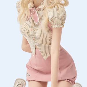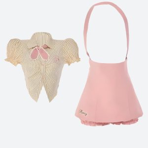The ensemble features a striped shirt with a delicate pink bow paired seamlessly with a coordinating pink skort that’s both playful and practical. This set is perfect for those who adore a sweet, polished look, combining vintage-inspired details with modern kawaii aesthetics. Ideal for a sunny day out or a whimsical gathering, it’s sure to bring a smile to everyone’s face.