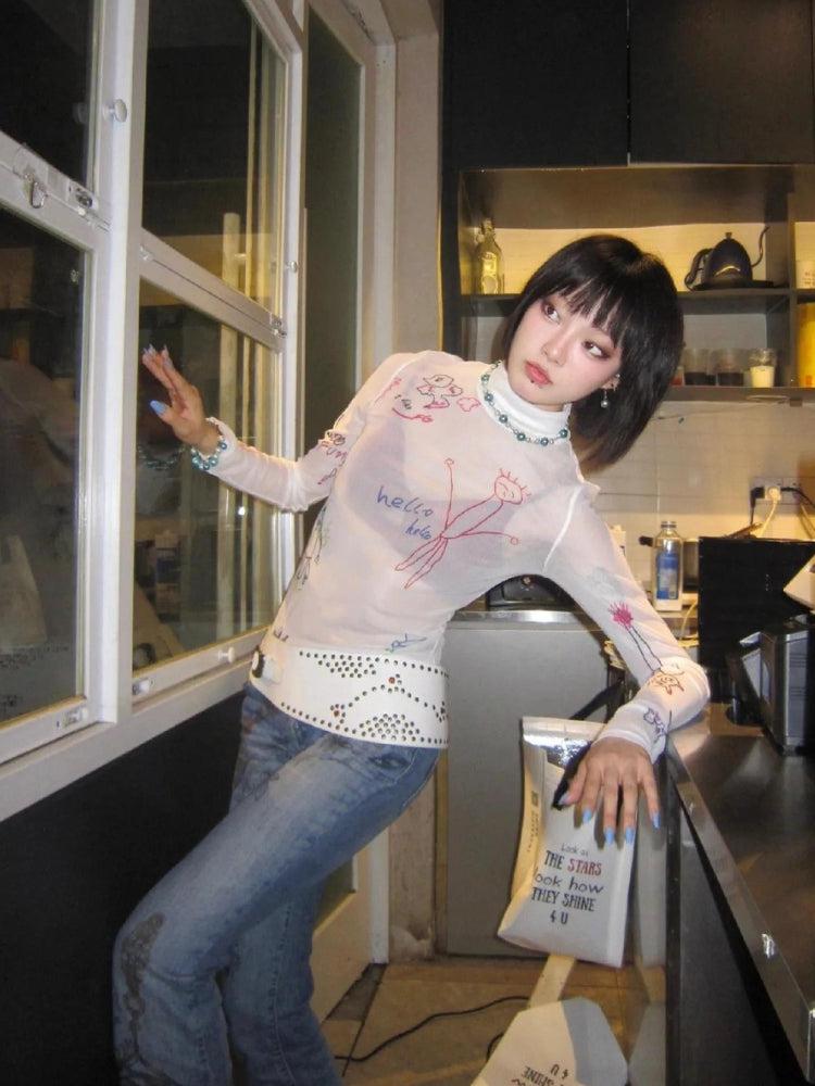 Channel playful vibes with this unique top, which beautifully showcases whimsical doodles reminiscent of a child’s sketchbook. The sheer fabric adds a contemporary edge, while the colorful drawings bring a sense of joy. This top is perfect for those looking to express their creative side. Pair it with casual jeans for a laid-back look.