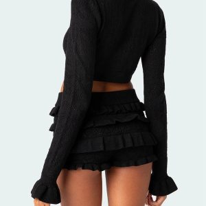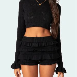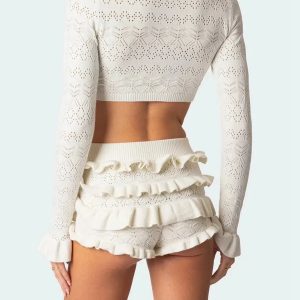 This chic ensemble features a delicately knitted crop top with intricate patterns, offering a perfect blend of style and comfort. Paired with high-waisted ruffled shorts, this set exudes femininity and playfulness. Crafted from soft, breathable fabric, this two-piece set is perfect for beach outings, casual brunches, or any summer adventure.