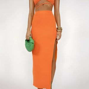 Captivate attention with this striking set, perfect for turning heads at any tropical getaway. The vibrant orange hue complements any skin tone, while the daring lace-up crop top and slit maxi skirt promise to highlight your best features with a hint of allure. This ensemble combines comfort with a touch of the exotic, ideal for those who love to make a style statement.