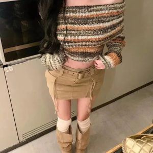 This off-shoulder cropped sweater combines effortless charm with a cozy knit design. The striped pattern adds dimension, while the flattering off-shoulder silhouette creates a laid-back yet chic look. Style it with high-waisted skirts or jeans for a versatile outfit.