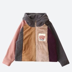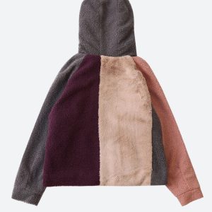 Stay cozy and stylish with this fluffy zip-up hoodie jacket. Its patchwork design and soft texture make it perfect for chilly days. Pair it with casual outfits for a relaxed yet trendy look.