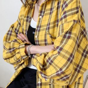 Step into vintage charm with this plaid print, puff sleeve shirt. Its classic collar and dual chest pockets convey a relaxed yet polished vibe. Crafted from enduring polyester, it champions both comfort and style. For a cozy oversized fit, consider sizing up. Perfectly complements your high-rise jeans and faux leather boots.