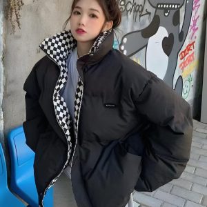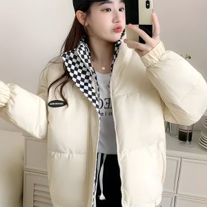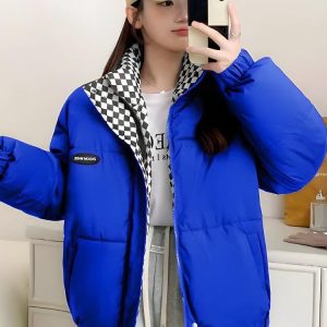 This Women’s Puffer Jacket delivers warmth with a trendy, oversized fit. The checkered lining contrasts the solid exterior for added style, while the zip-up front and elastic hem ensure comfort. Perfect for layering over casual outfits and adding a statement to your cold-weather wardrobe.