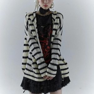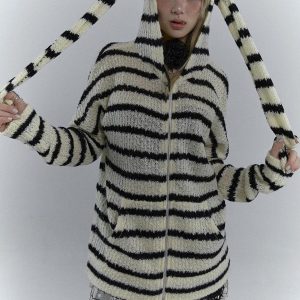 Step into the streets with an audacious blend of grunge and mystique. This hooded cardigan, with playful rabbit ears, adds a quirky twist to the dark street style. Striped design interwoven with cotton and polyester ensures comfort, while the zip fastening button secures the vibe. An ideal pick for women who like to wander off the beaten path.