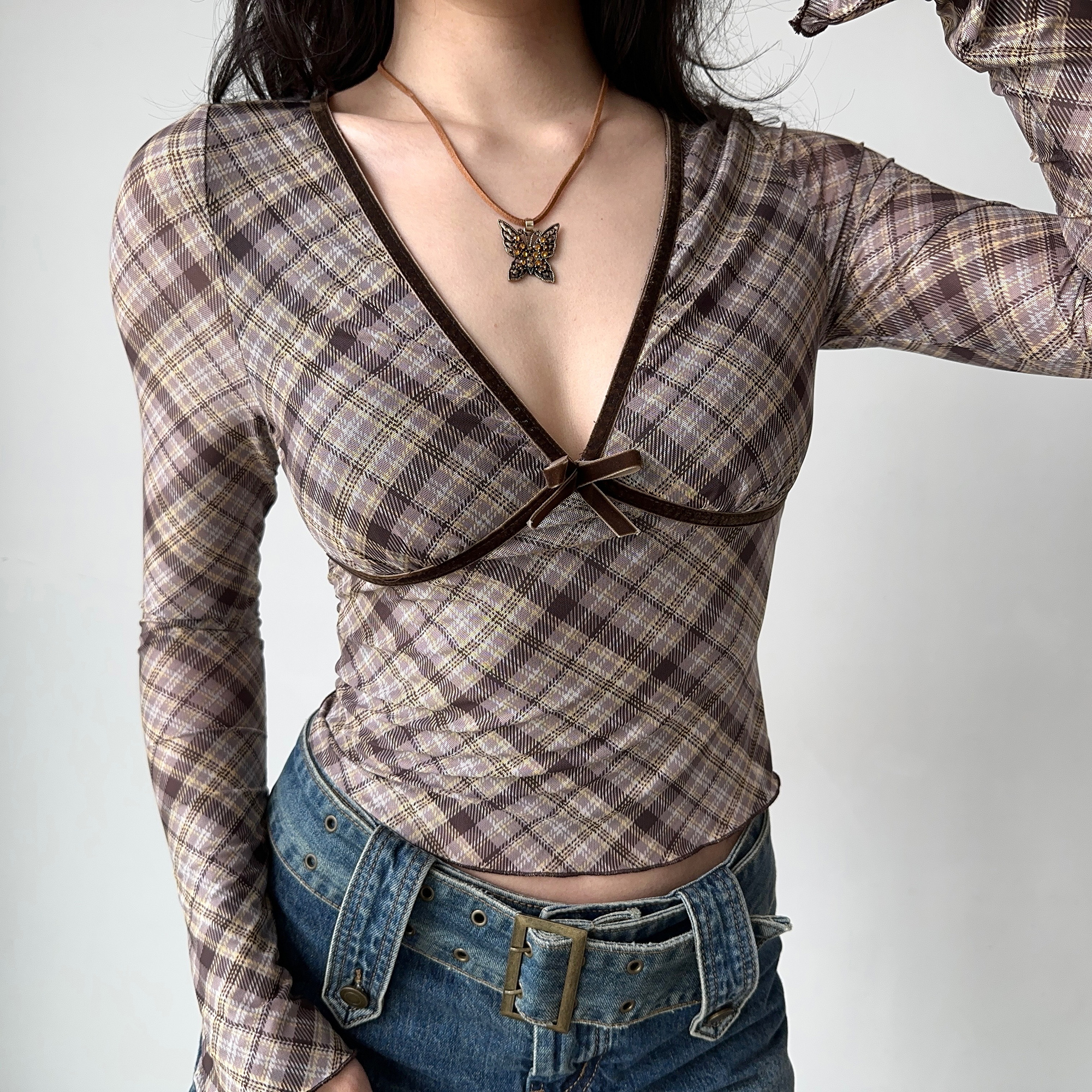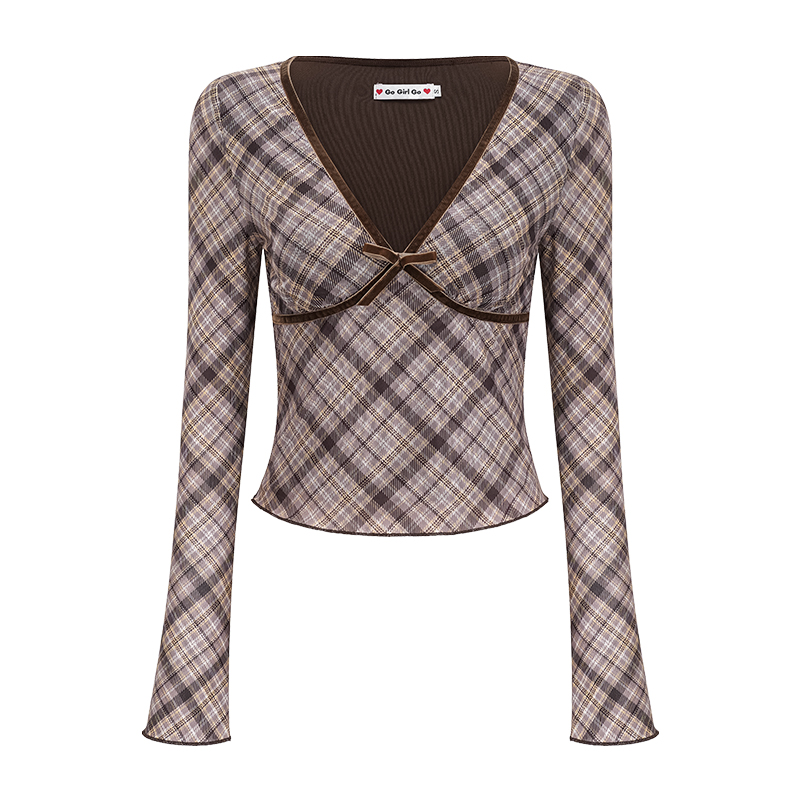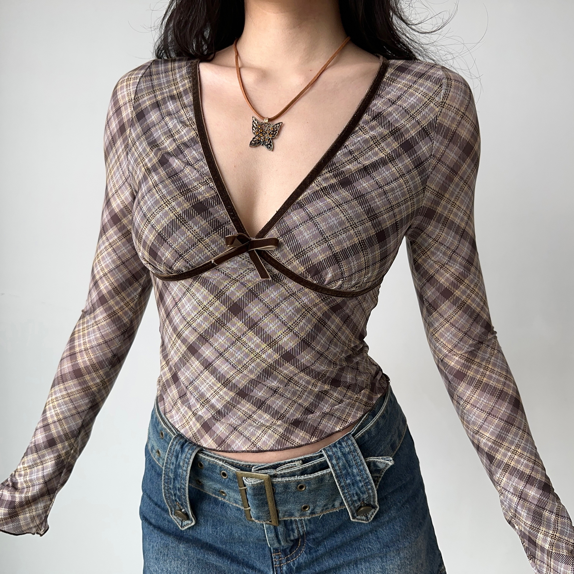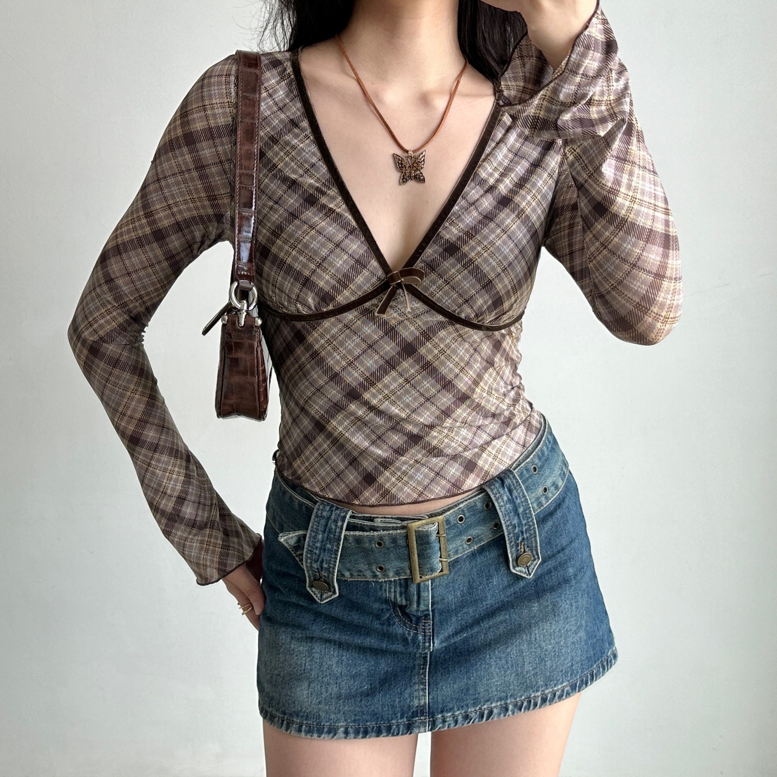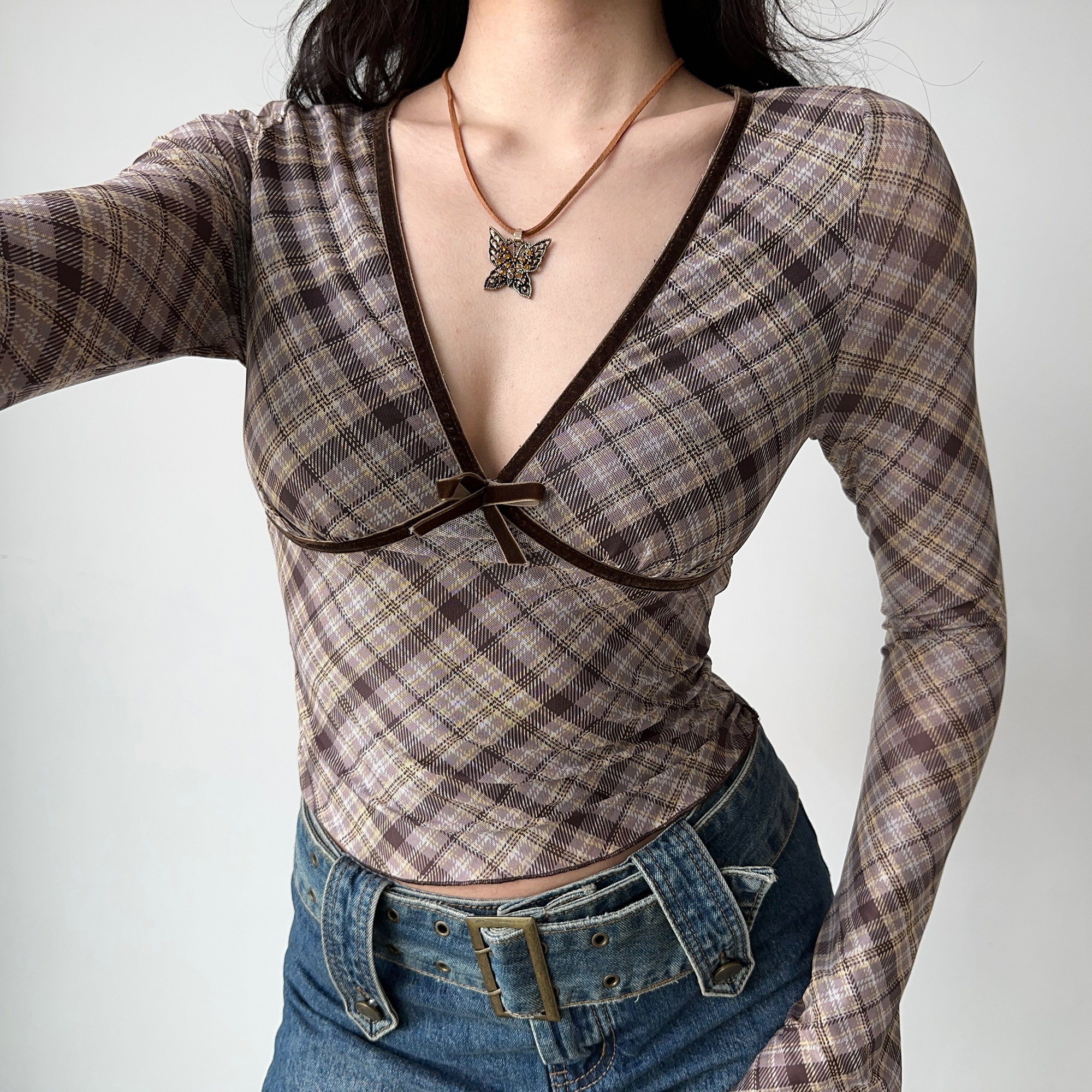 Retro Deep V- Neck Long Sleeve Plaid T- Shirt Women Slim Fit – Outfit Ideas