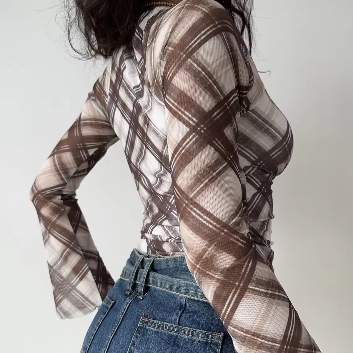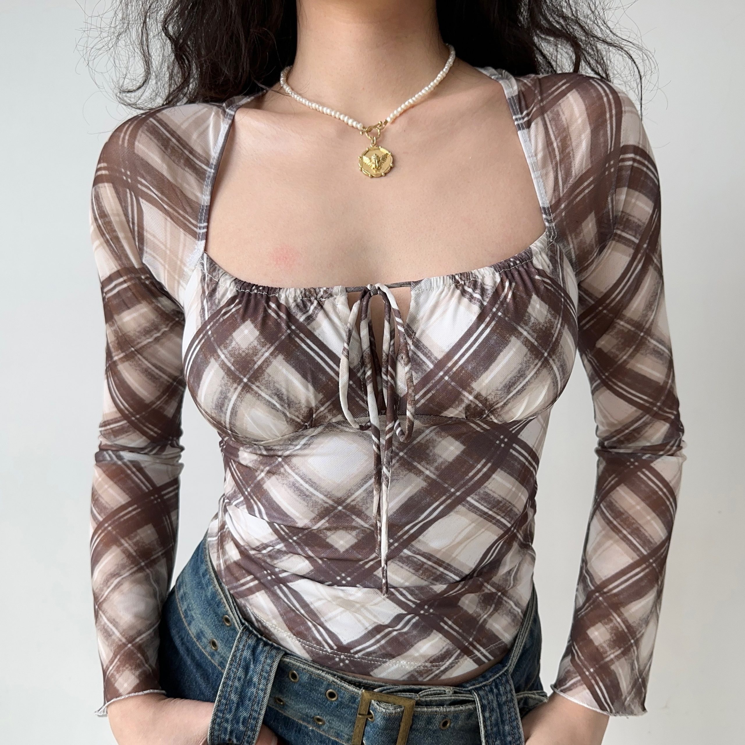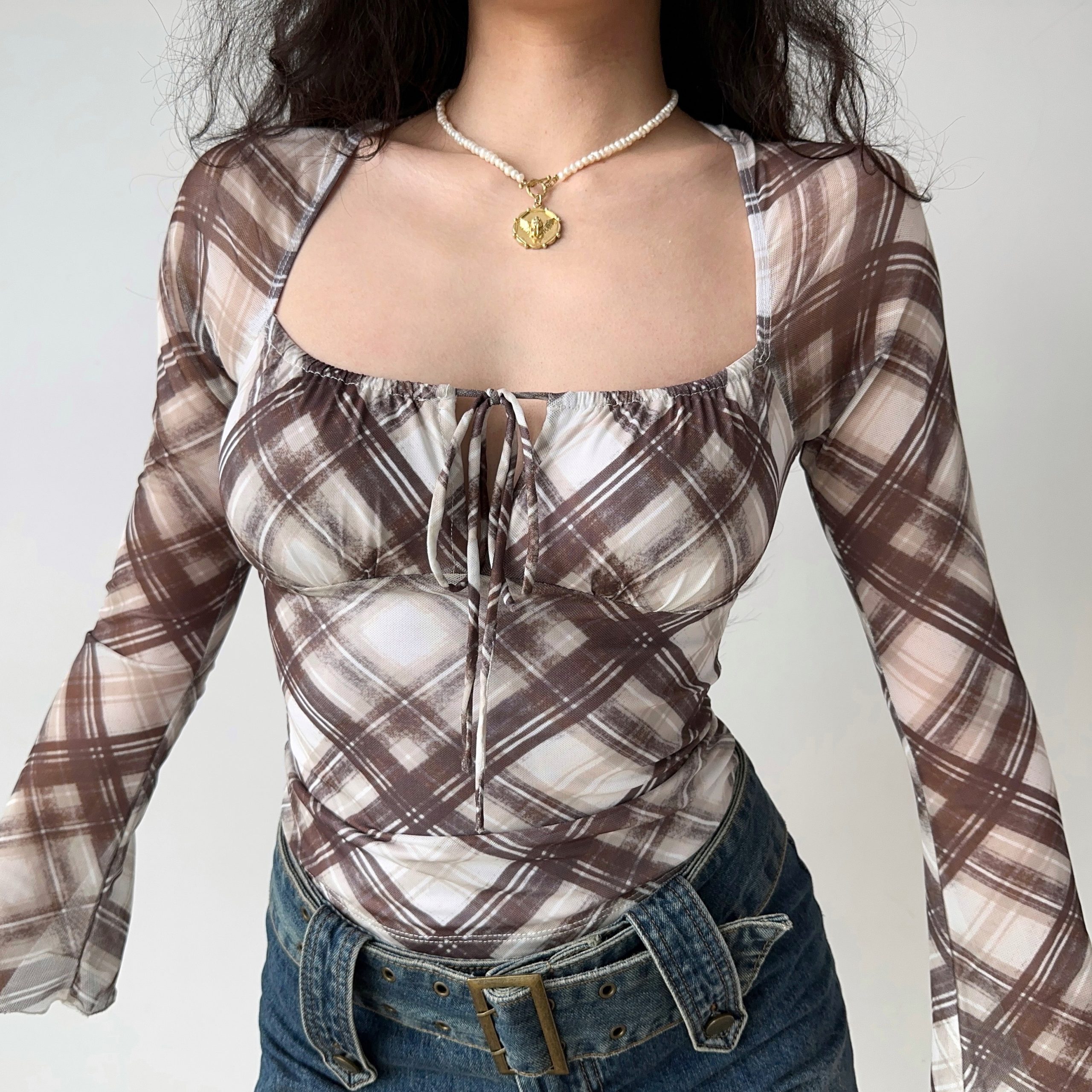 Retro Plaid Tie Up Square Collar Long Sleeve Shirt Women Slim Fit Top High-quality product featuring prom dresses, spring outfits, business casual outfits and more. Modern design that fits the latest trends. Premium materials ensure durability and comfort. Order now for special offers! Product designed with attention to every detail. Suitable for all occasions and personal styles.