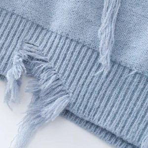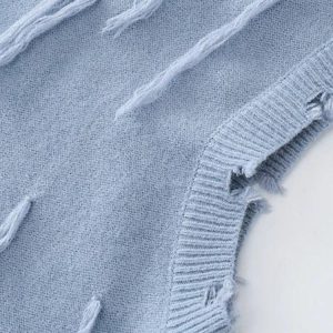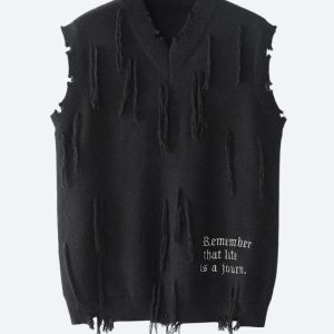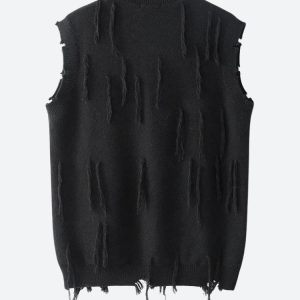 Embrace an edgy look with this unisex sweater vest, crafted from knit material and featuring ripped details at the collar, shoulders, and hem. It’s a versatile piece for streetwear enthusiasts, suitable for both cool fall days and winter weather.