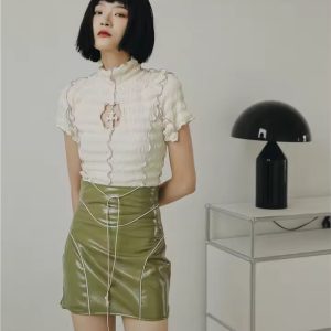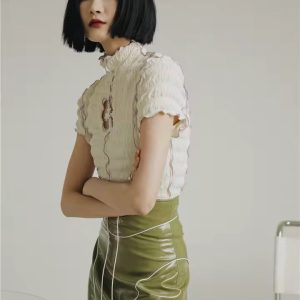 The Ruched Top offers a chic, textured look with a playful keyhole cutout. Its frilled neckline and edges bring vintage charm, making it perfect for pairing with high-waisted skirts for day-to-night elegance.