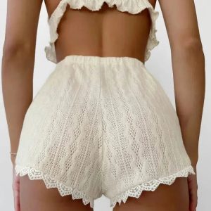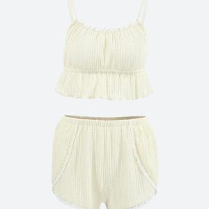 This set features a charming crop top and shorts, crafted from breathable fabric. The crop top offers a snug fit with adjustable straps and intricate lace detailing, while the high rise shorts provide comfort with an elastic waistband and soft, flowing design. Perfect for lounging or casual summer days, this set embodies a sweet and whimsical aesthetic, blending comfort with playful style.