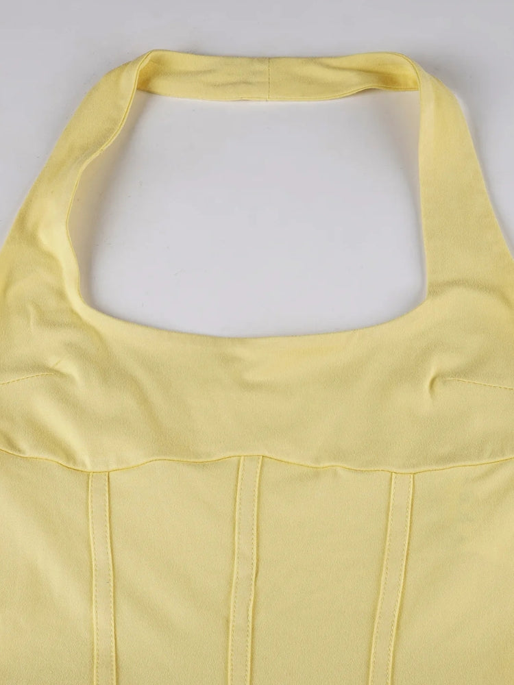 The Ruffled Halter Mini Dress brings sunshine to your wardrobe. With a sculpted bodice and flirty layered skirt, it’s your go-to for golden hour, beach dates, or rooftop drinks.