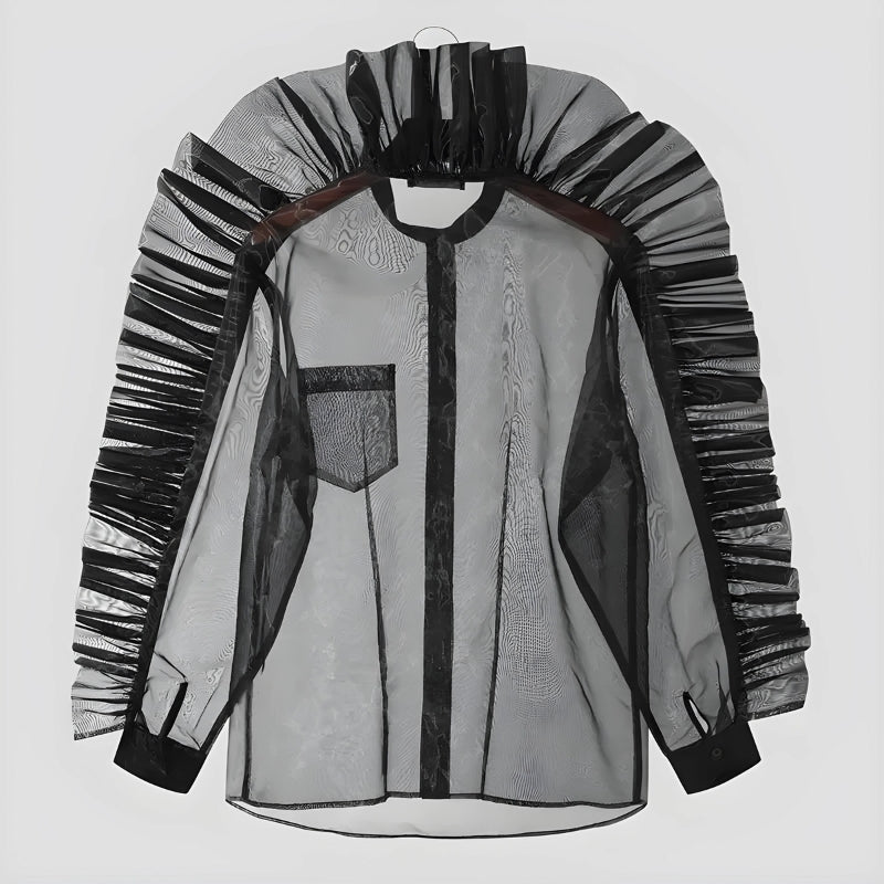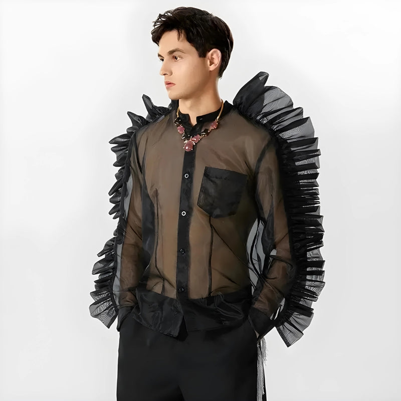 Stand out with this daring shirt. Featuring dramatic ruffles and a transparent fabric, this shirt is designed to make a bold fashion statement. Perfect for fashion-forward individuals, it combines elegance with avant-garde style. Pair it with high-waisted trousers or a skirt for an unforgettable look that exudes confidence.