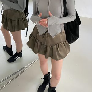 Give your fit some bounce with this balloon-hem mini skirt. The khaki tone, ruched tiers, and drawstring waist bring sporty balletcore energy to your everyday aesthetic. Pair it with cropped jackets, leg warmers, or boots for a street-cute combo.