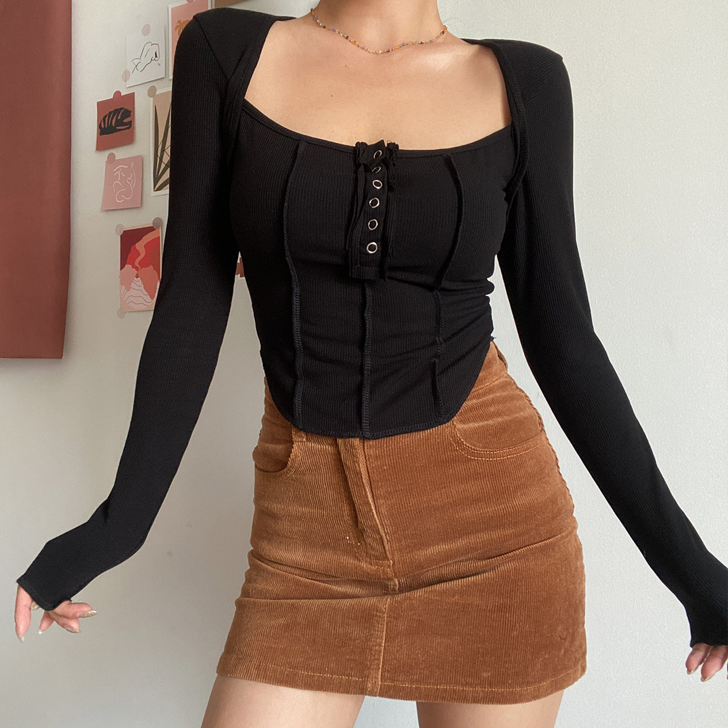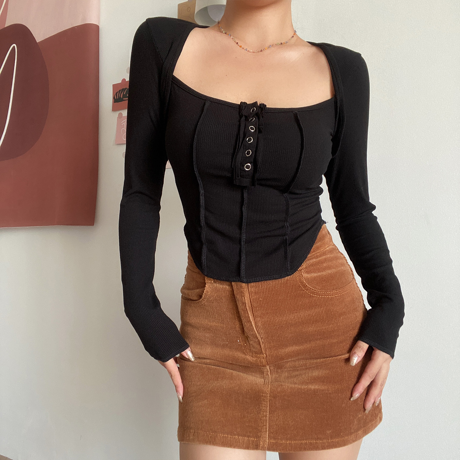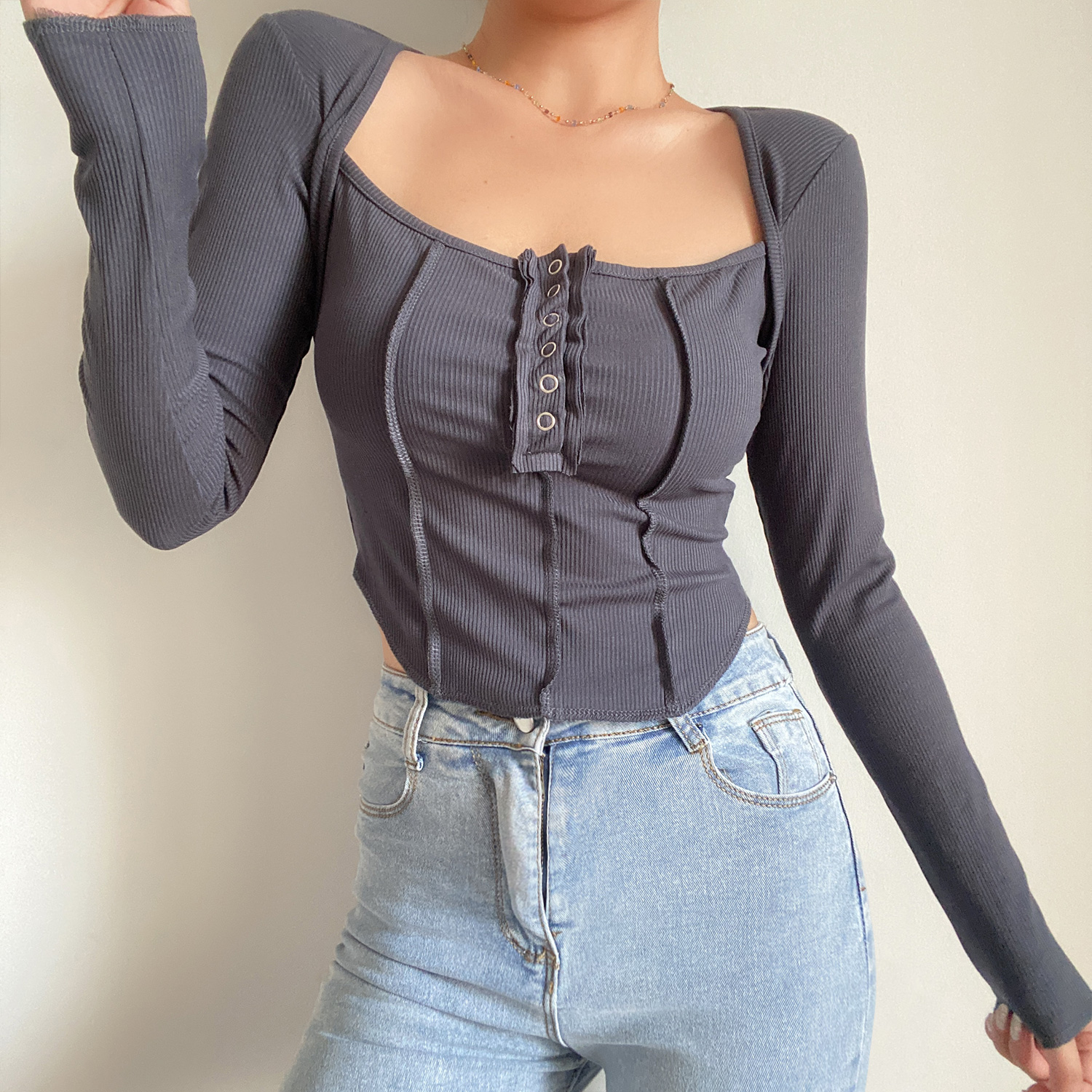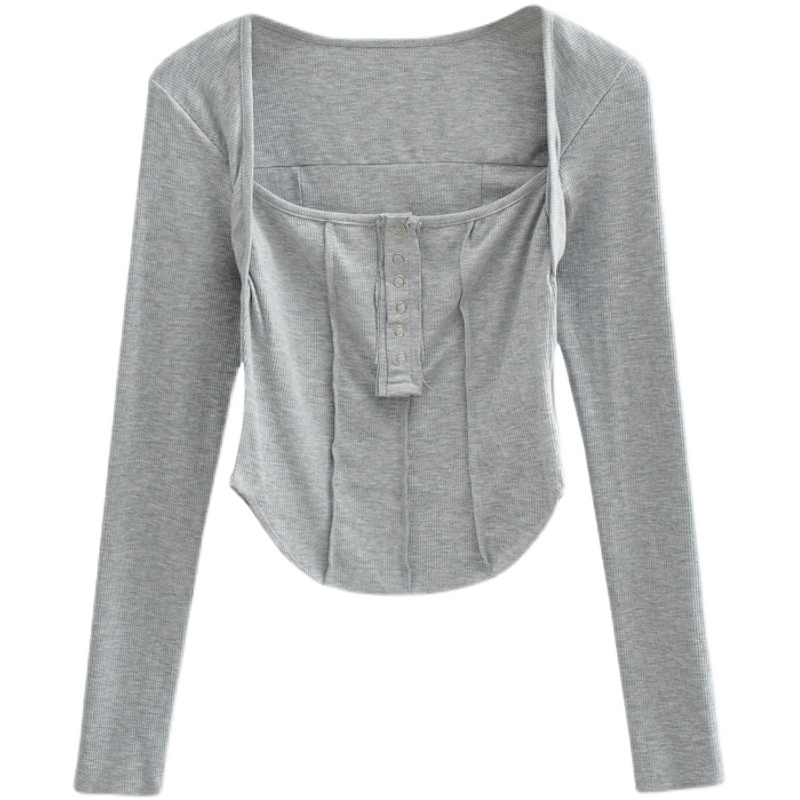 Square Neck Button Long Sleeve T- shirt Low Cut Clavicle Top High-quality product featuring prom dresses, spring outfits, business casual outfits and more. Modern design that fits the latest trends. Premium materials ensure durability and comfort. Order now for special offers! Product designed with attention to every detail. Suitable for all occasions and personal styles.