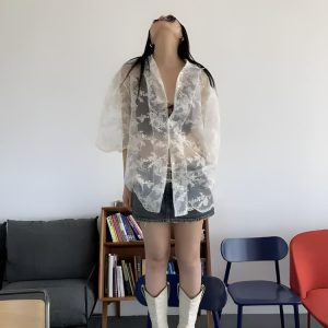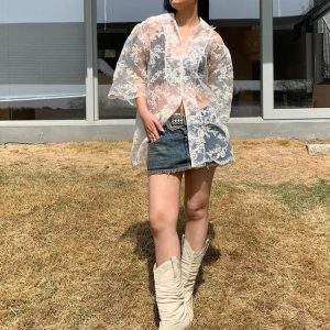 Delicate lace with floral embroidery creates a dreamy layered look. The sheer fabric makes it easy to style over camis, bralettes, or crop tops for a chic aesthetic. Its oversized fit adds a relaxed vibe while still giving a soft, feminine edge to everyday outfits.