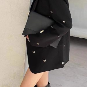 Make a bold fashion statement with this blazer. Adorned with heart embellishments, this black blazer combines classic tailoring with playful details. Its slim fit ensures comfort and style, perfect for layering over any outfit. Elevate your look with this chic and unique piece.