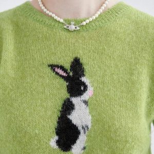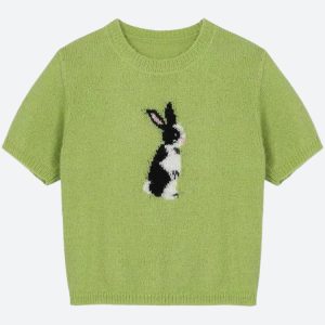 This delightful knitted top in a vibrant green hue features an adorable rabbit motif, bringing a playful touch to your wardrobe. The soft material ensures comfort, while the short sleeves make it perfect for layering or wearing on its own. Ideal for creating a cute and casual look, this top pairs beautifully with jeans or skirts, making it a versatile addition to your collection.