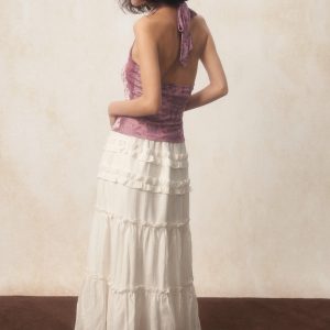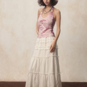 This rose halter top embodies romantic charm with its soft pink hues and intricate floral print. The lightweight fabric and stylish halter rings make it a versatile pick for summer or casual outings.