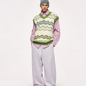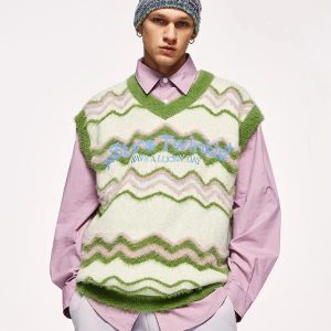 Stay cozy and stylish with this unisex fluffy sweater vest. Its soft touch knit material and unique zigzag pattern make it a perfect addition to any soft girl or soft boy’s winter wardrobe, combining comfort with a touch of whimsy.
