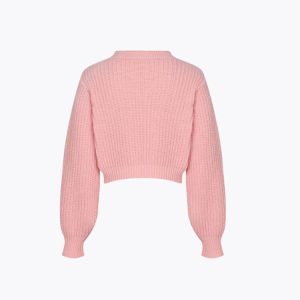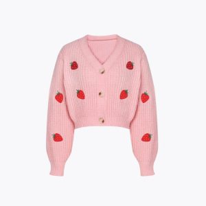 Strawberry Cropped Knit Cardigan is designed with a cropped silhouette and a soft knit texture for lightweight layering. The V neckline and front button closure create a clean structure, while embroidered strawberry motifs are integrated into the surface. Long sleeves provide full coverage, and ribbed cuffs and hem help maintain shape. The stretch knit fabric supports comfort and flexibility during regular wear.