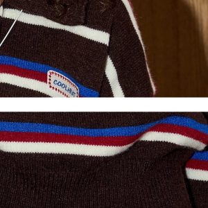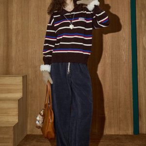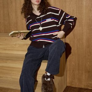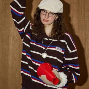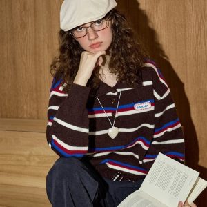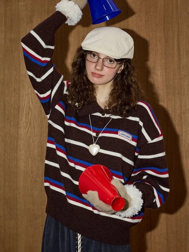 This striped polo collar sweater brings a relaxed, vintage-inspired look with its bold color lines and soft knit feel. The loose silhouette keeps it comfortable for everyday wear, while the polo neckline adds structure that balances the casual fit. An easy layering piece that suits chill days, campus looks, and laid-back styling.