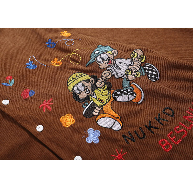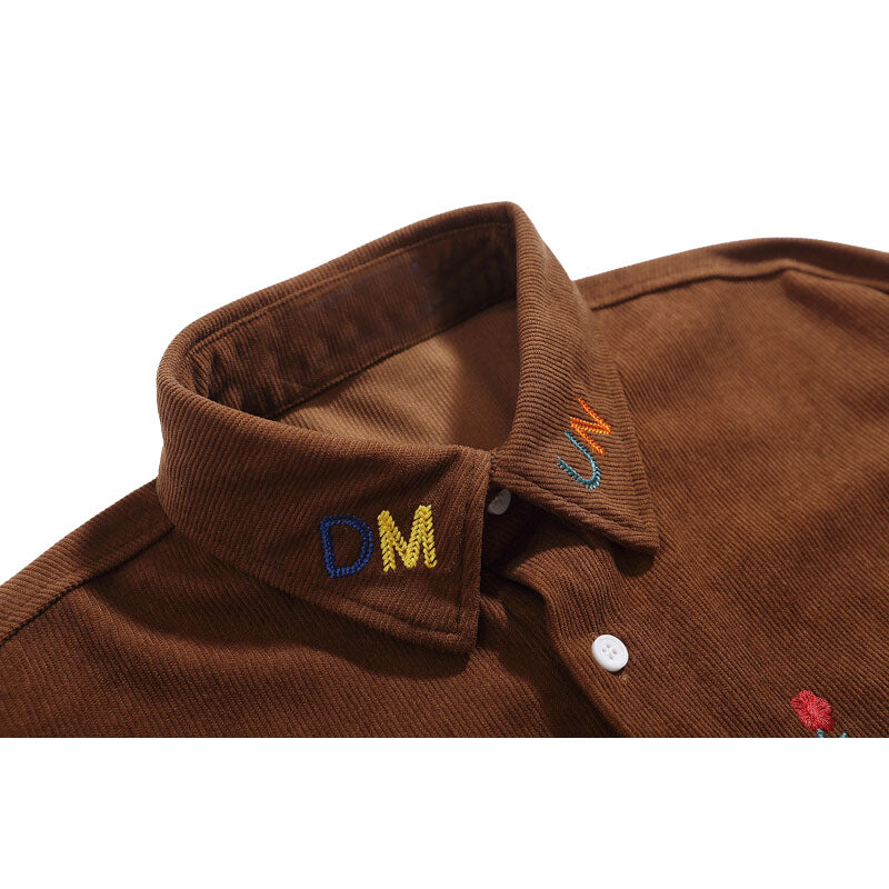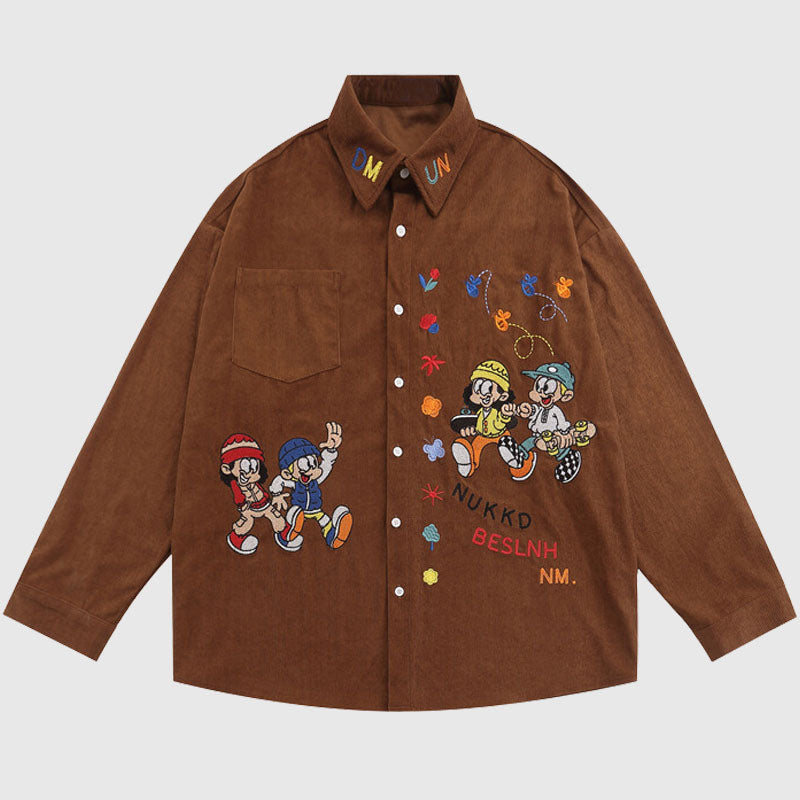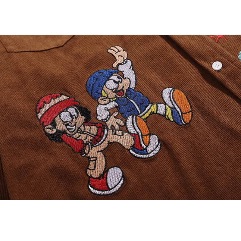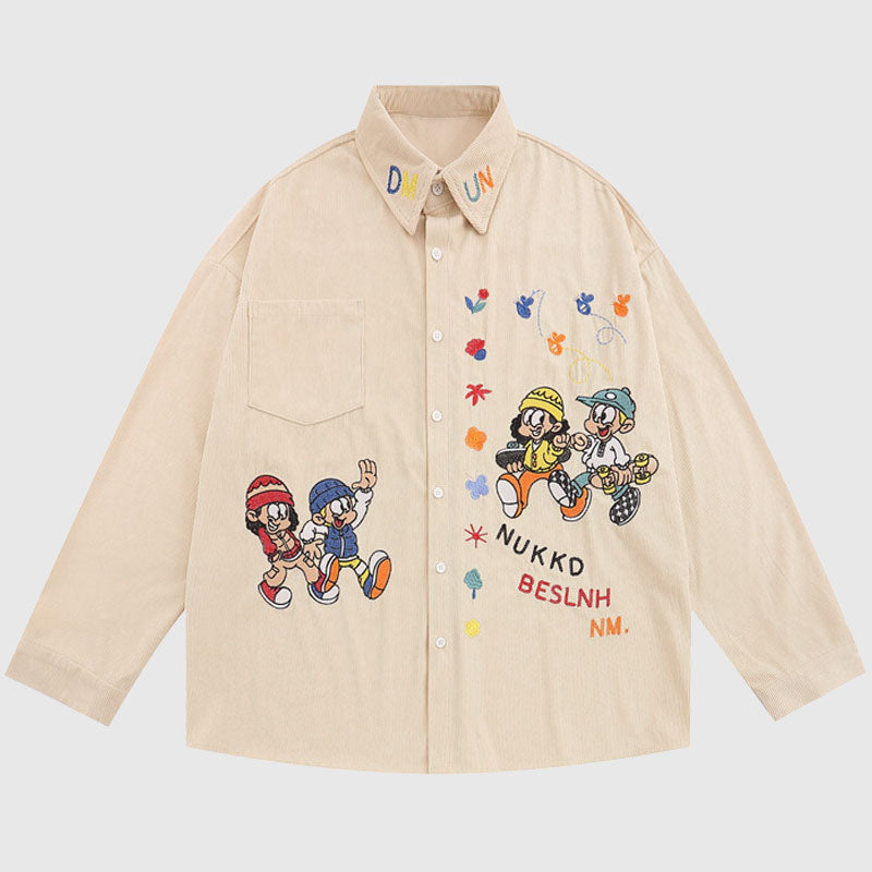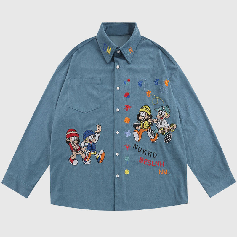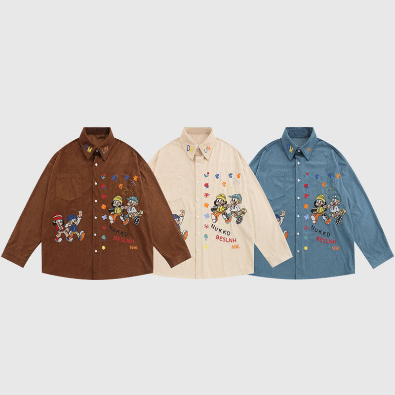Features: Shirts, lapel, long sleeve, cartoon pattern embroidered design, relaxed fit, soft and breathable, unisex, couple outfits.