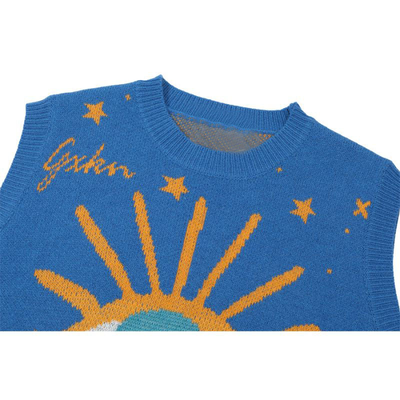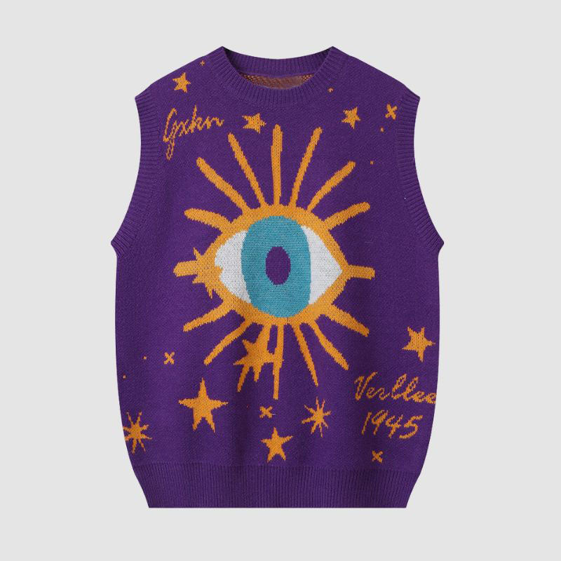 Features: Vest, v-neck, sleeveless, pullover, eyes oattern jacquard design, relaxed fit, jacquard weave, couple outfits