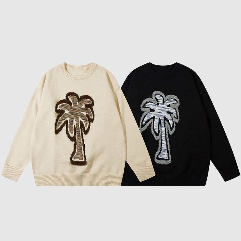 Features: Pullover, crew neck, long sleeve, coconut tree pattern embroidered design, relaxed fit, jacquard weave, couple outfits.