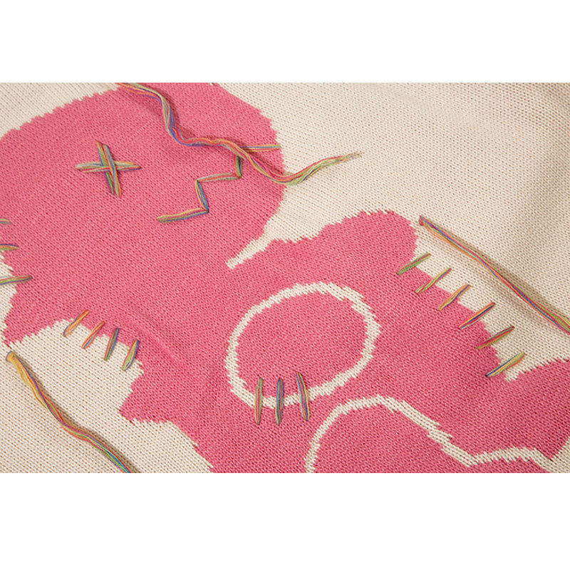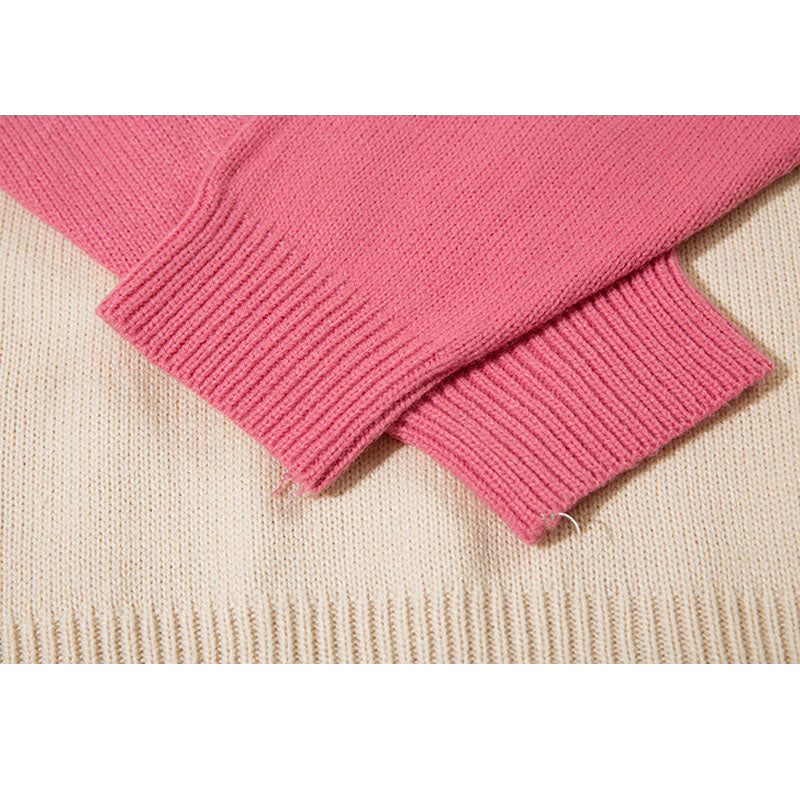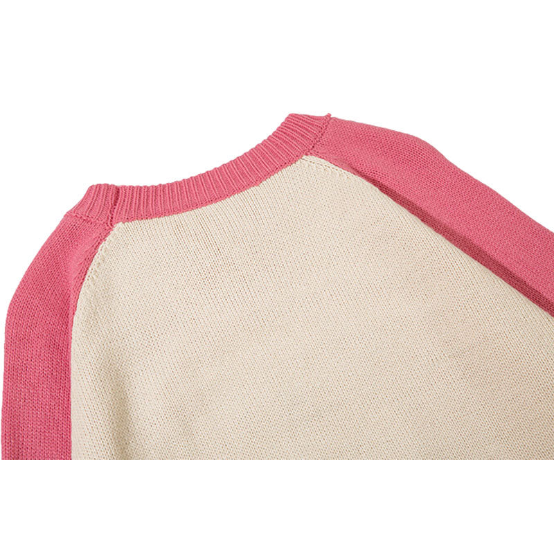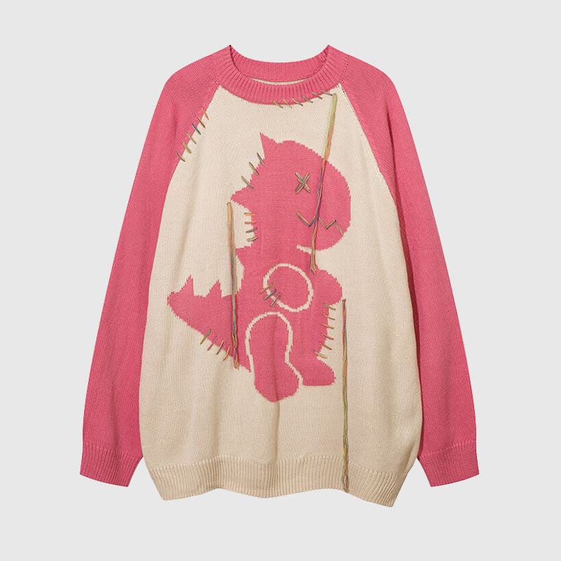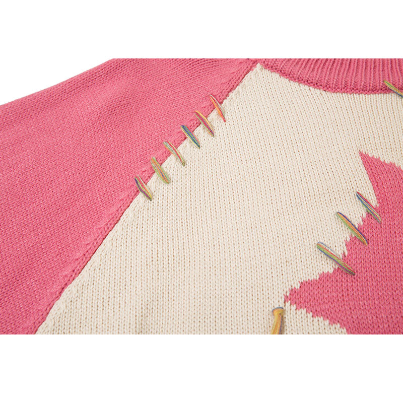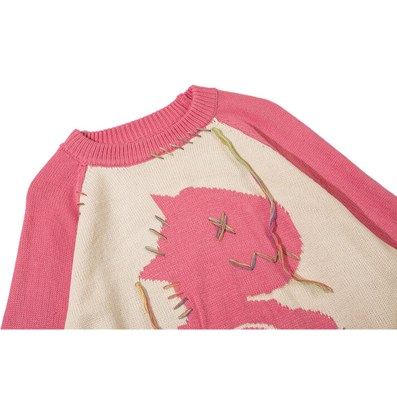 Features: Pullover, crew neck, long sleeve, color contrast, dinosaur patchwork design, vintage, knit, relaxed fit, jacquard weave, couple outfits.