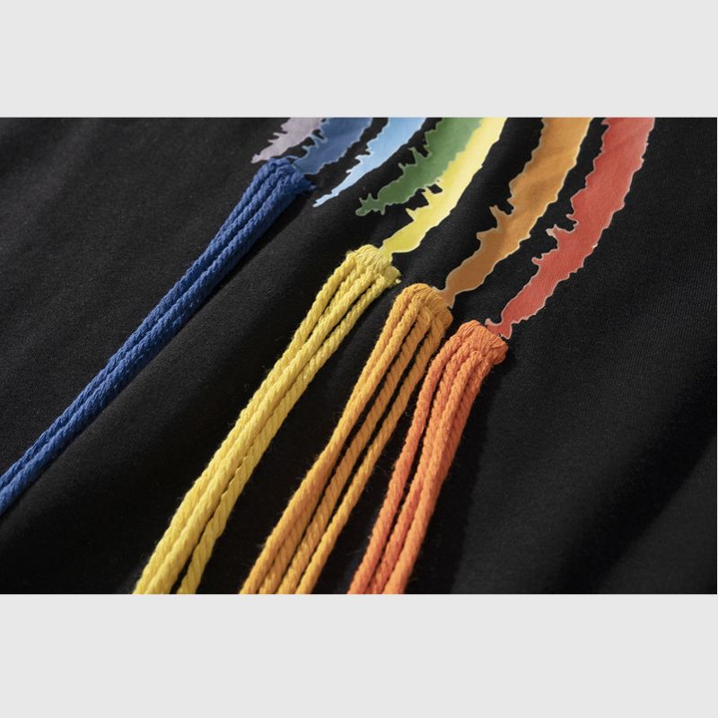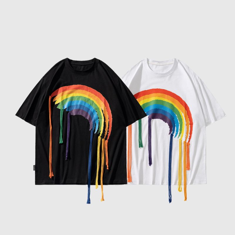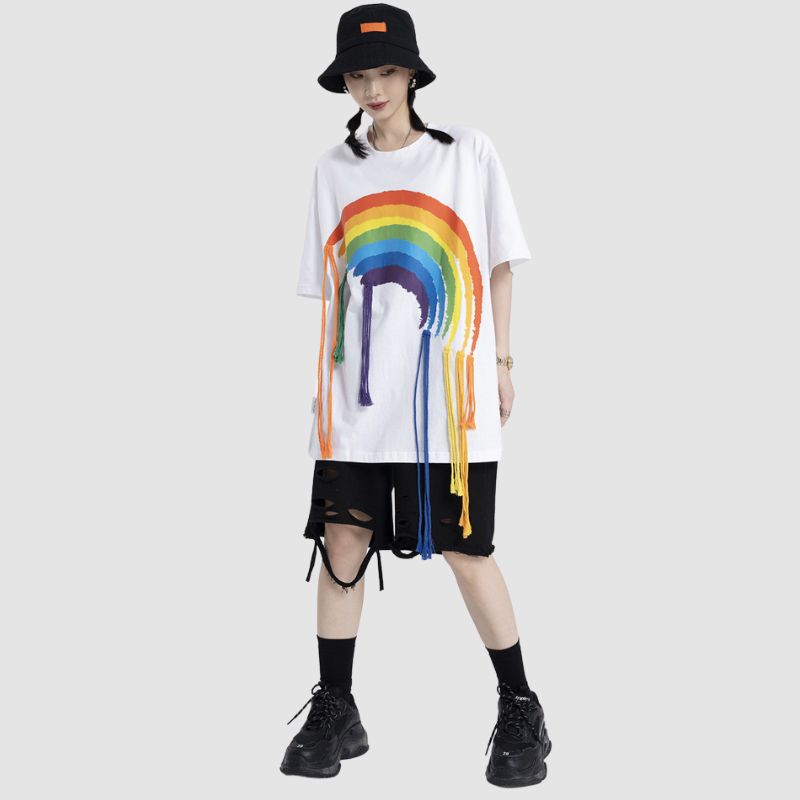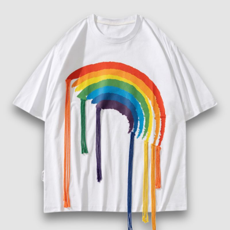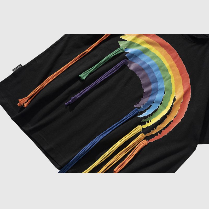 Features: Tee, crew neck, short sleeves, color contrast, rainbow pattern printed, tassel decor, loose fit, soft and breathable, unisex.