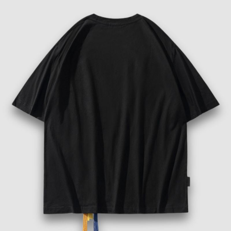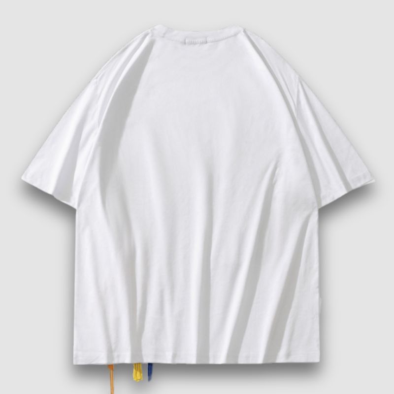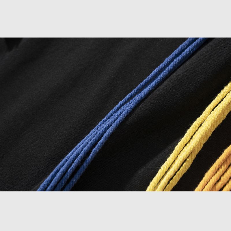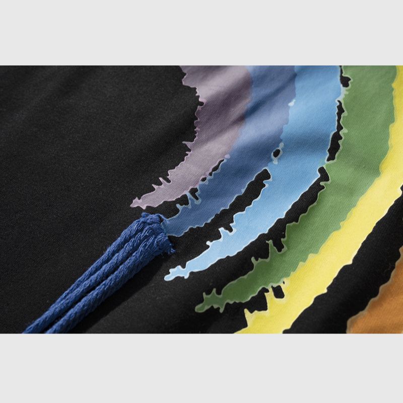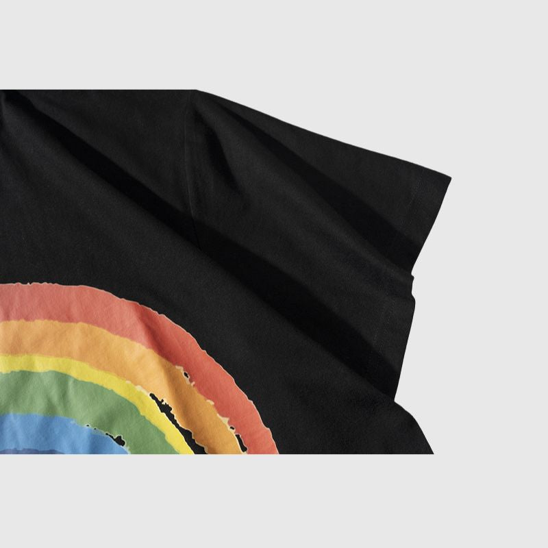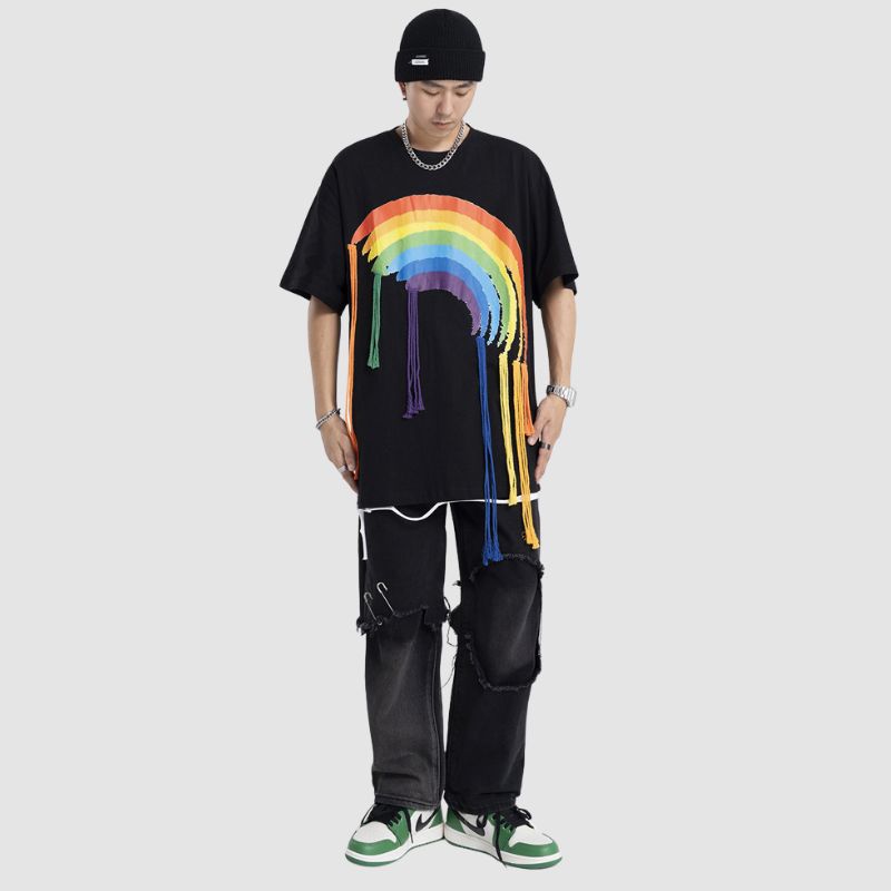 Features: Tee, crew neck, short sleeves, color contrast, rainbow pattern printed, tassel decor, loose fit, soft and breathable, unisex.