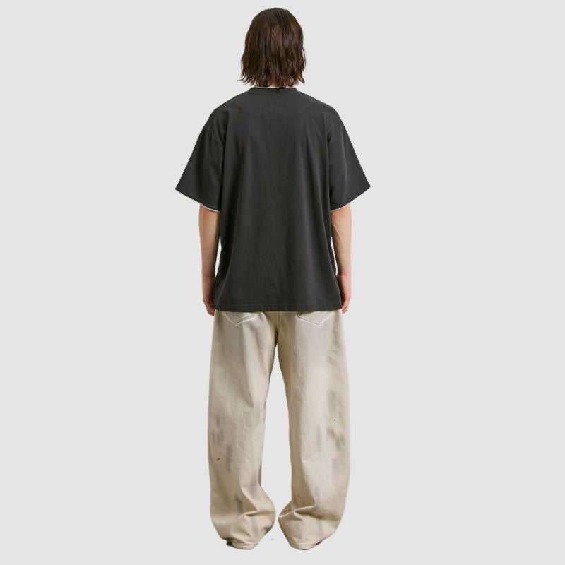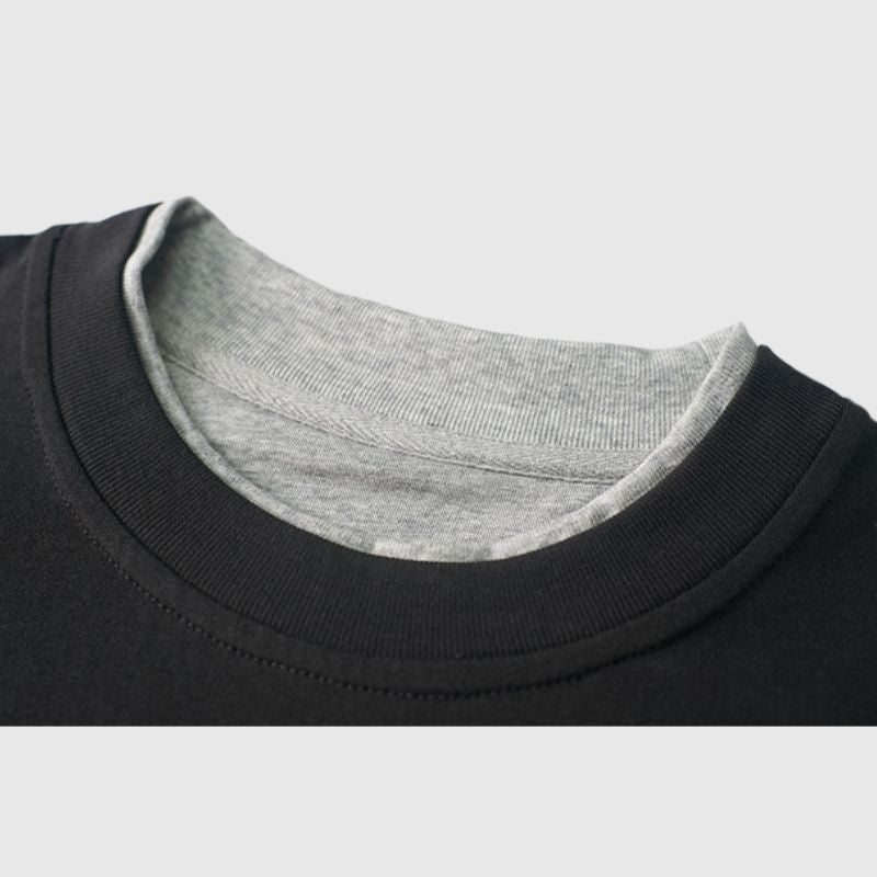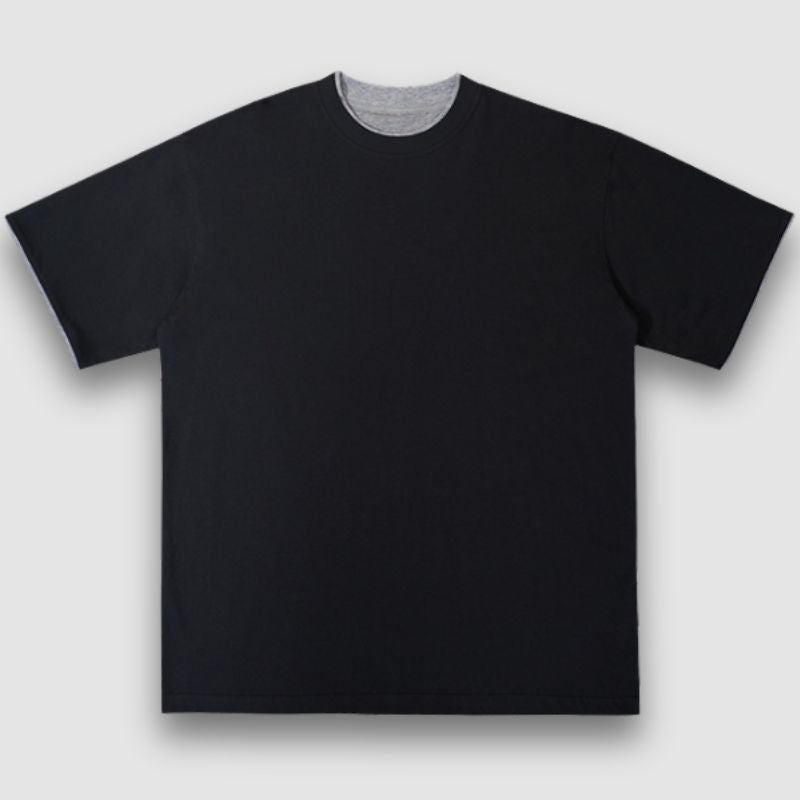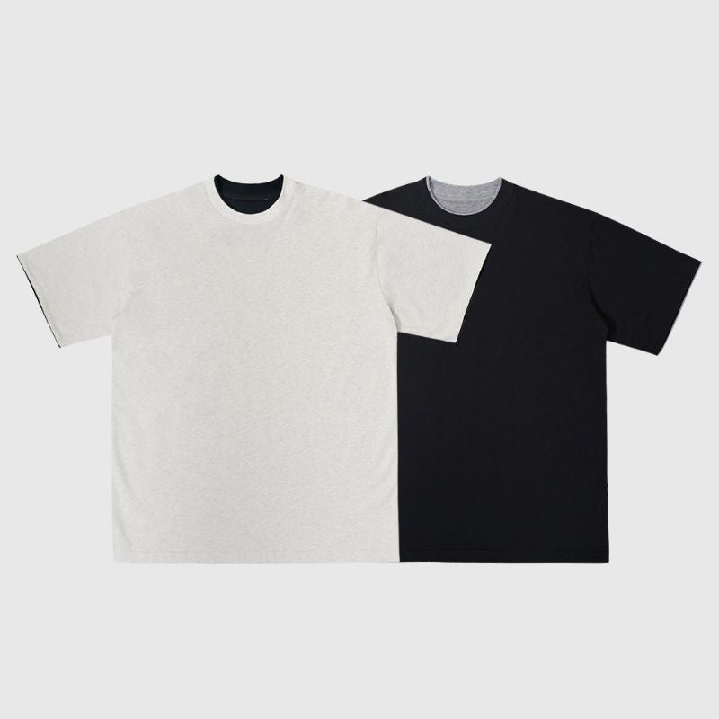 Features: Tee, crew neck, short sleeves, solid color, fake two-piece design, loose fit, soft and breathable, unisex.