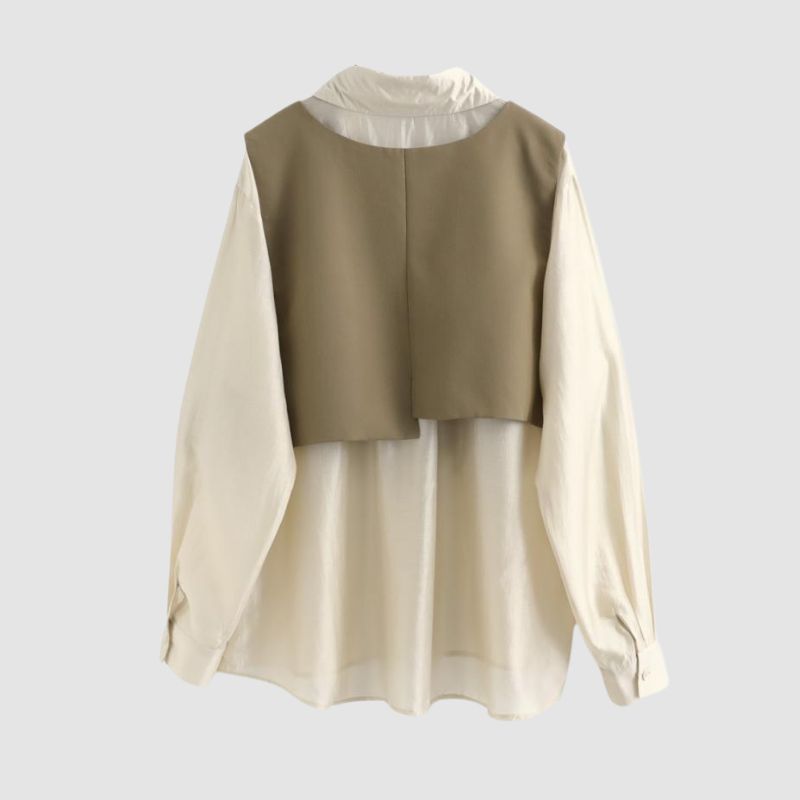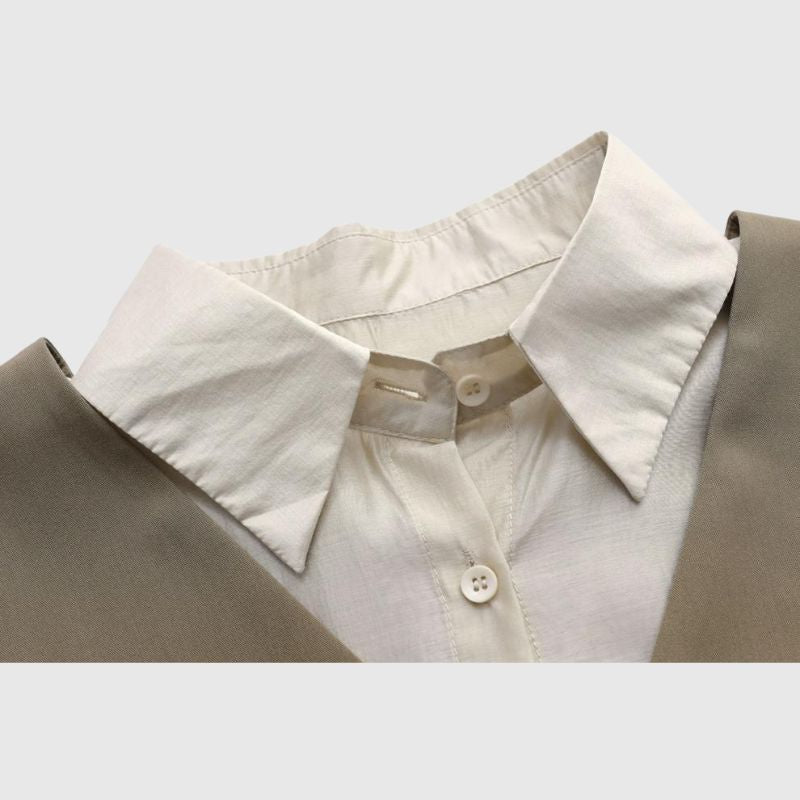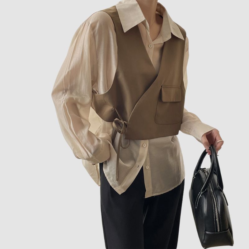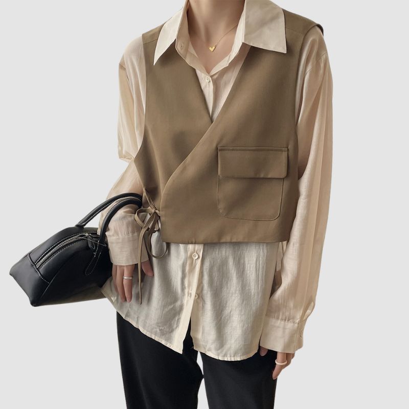 Features: Shirts, vest, two-piece set, lapel, long sleeve, color contrast, strap vest, pocket patchwork, relaxed fit, soft and breathable, unisex, couple outfits.