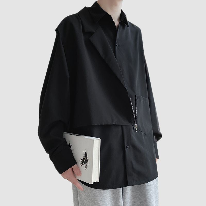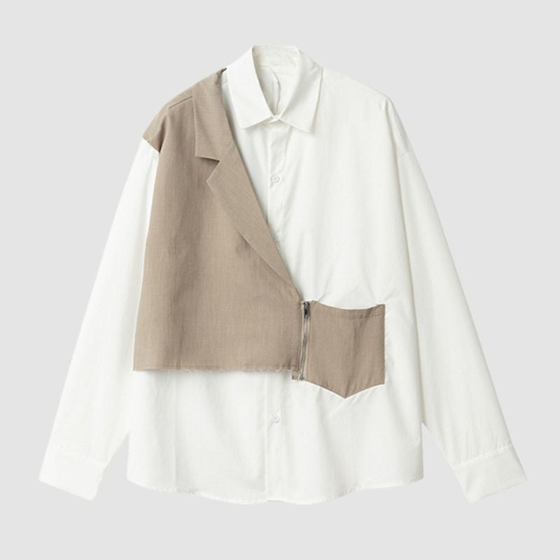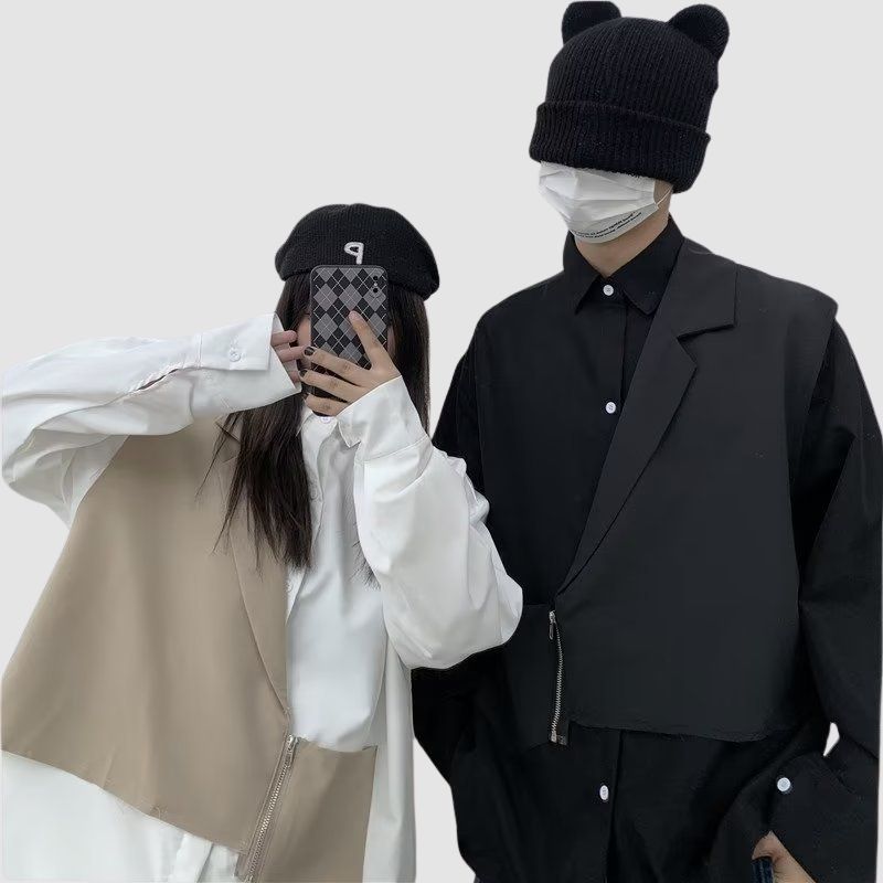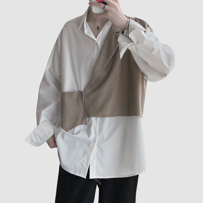 Features: Shirts, lapel, long sleeve, color contrast, zipper vest patchwork, relaxed fit, soft and breathable, unisex, couple outfits.