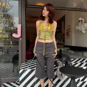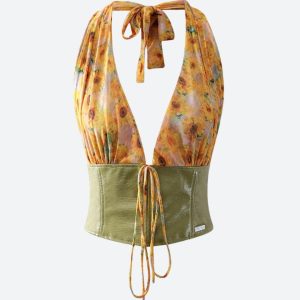 Sheer sunflower halter meets glossy green corset for a dreamy, flirty vibe. This Y2K-inspired date night top turns heads with its bold mix of textures and backless silhouette.
